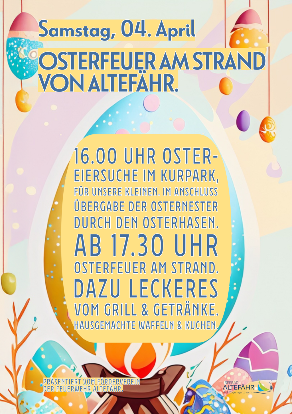 Gemeinsam zu Ostern treffen wir uns am Strand zum Osterfeuer. Für die Kleinen heißt es wieder Osterhase suchen, was mit einen Osternest belohnt wird.