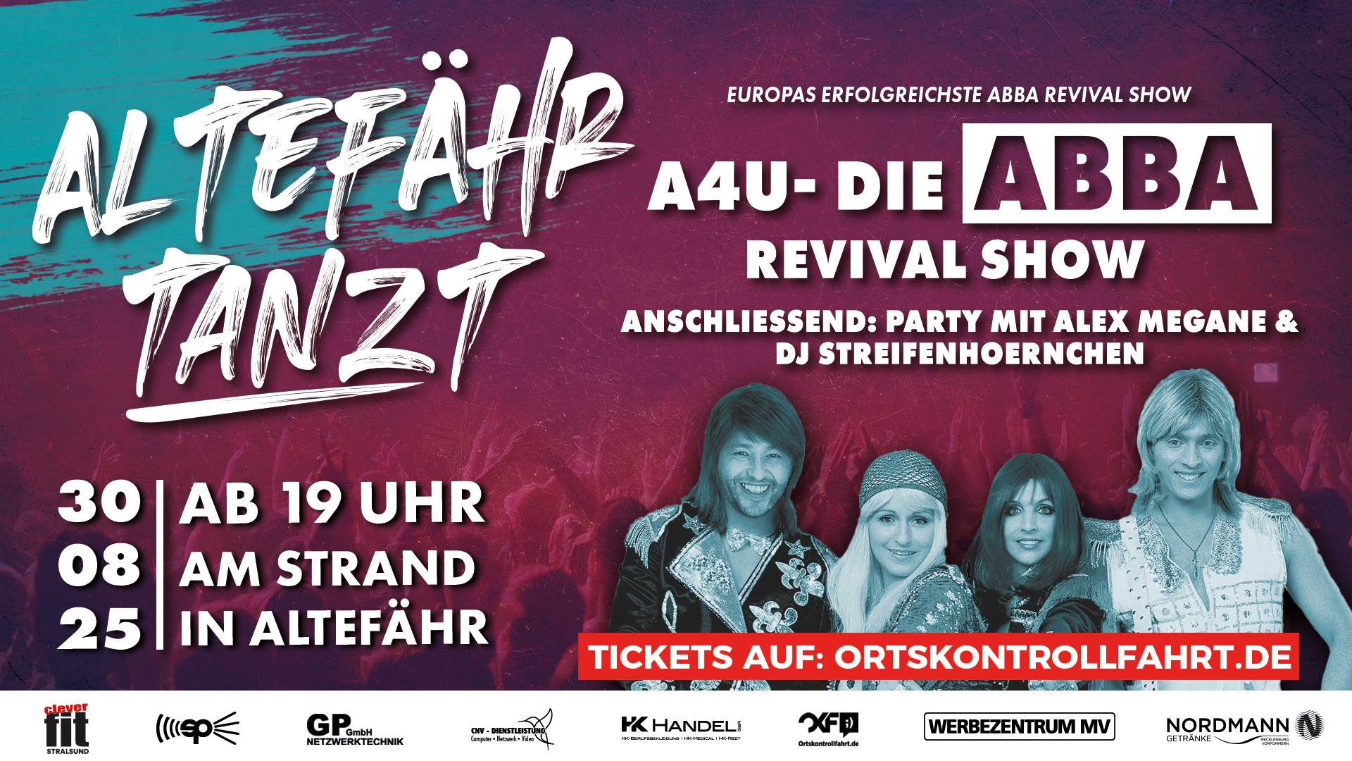 Ab 19.00 Uhr gibt es am Strand die A4U - ABBA Revival Show. Danach wird zu heißen Rhythmen im Sand weiter getanzt.
