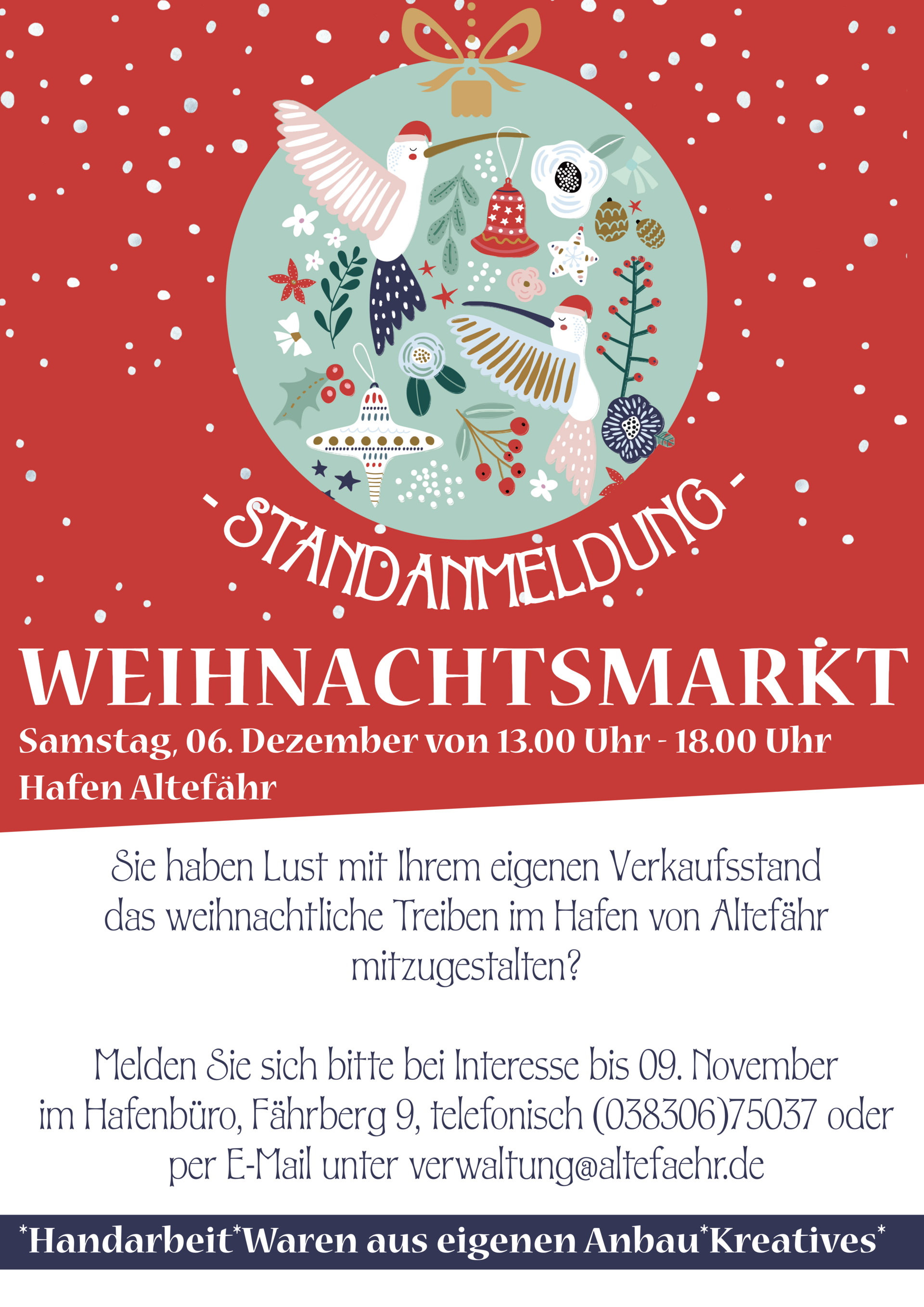 Von 13.00 Uhr bis 18.00 Uhr im Hafen von Altefähr. Fühlen Sie sich eingeladen, zum gemütlichen Zusammenkommen voller festlichen Spaß für Klein & Groß, köstlichen Leckerein und regionalen Angeboten.