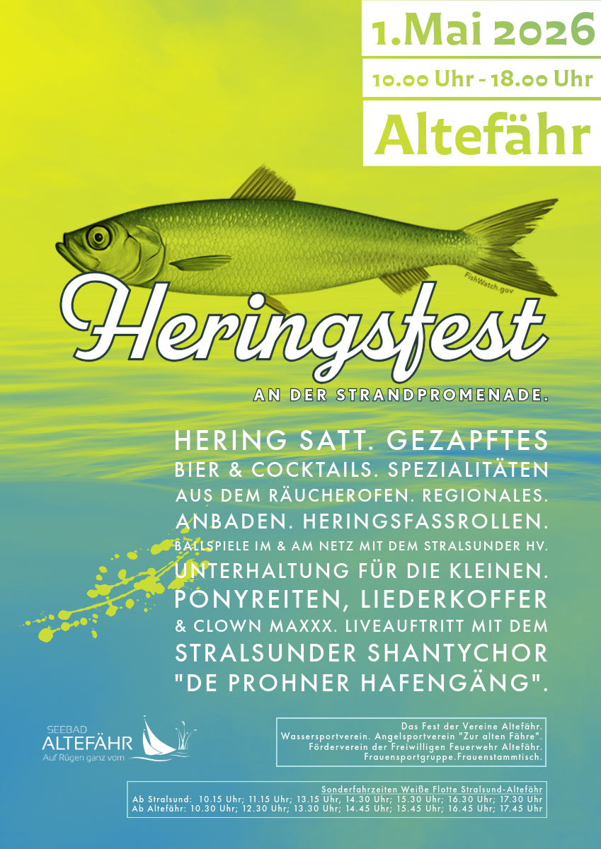 Die Altefäherer Vereine laden zum alljährlich legendären Heringsfest an der Strandpromenade ein, mit reichlich Fisch und bunten Programm.
